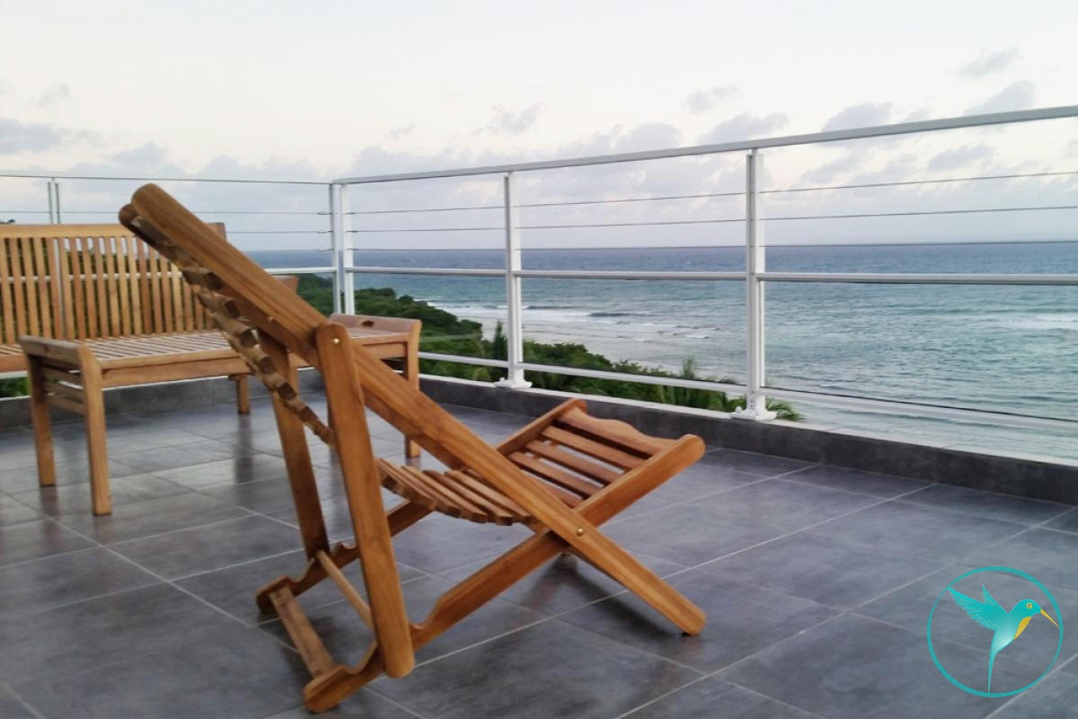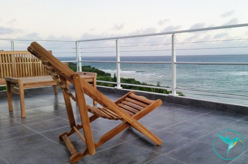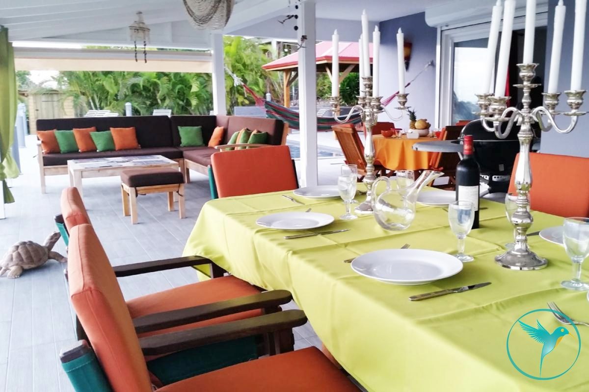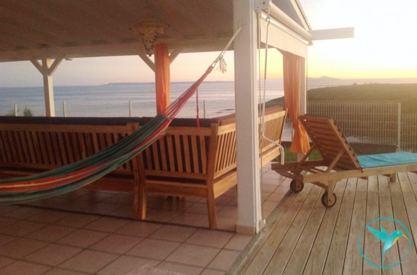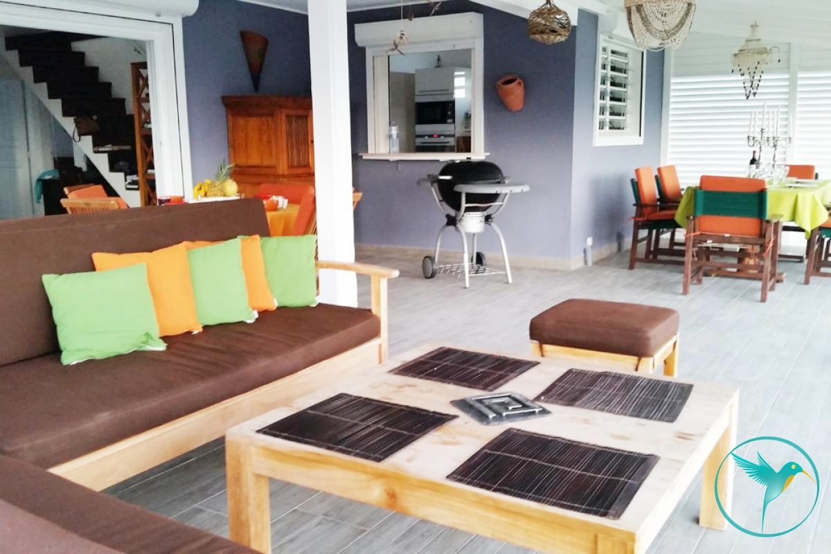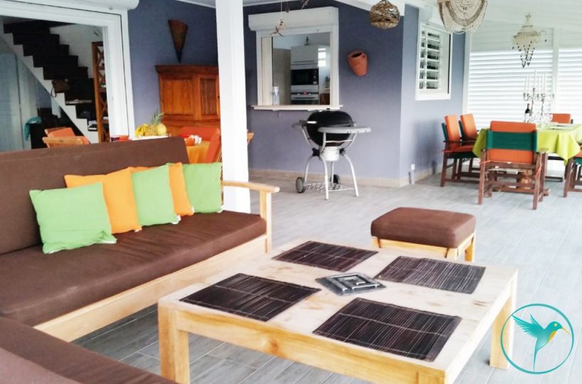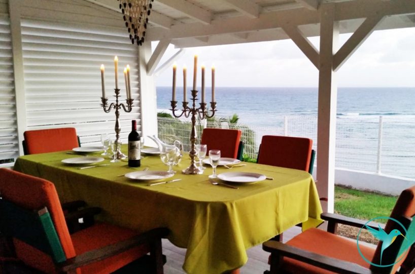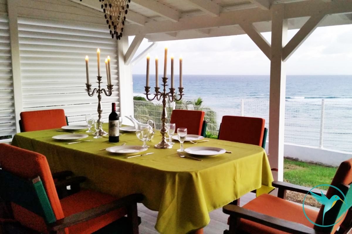 - 1 Grande terrasse couverte meublée de tables et chaises pour les repas et d’un coin salon pour siroter un Ti Punch face à la mer