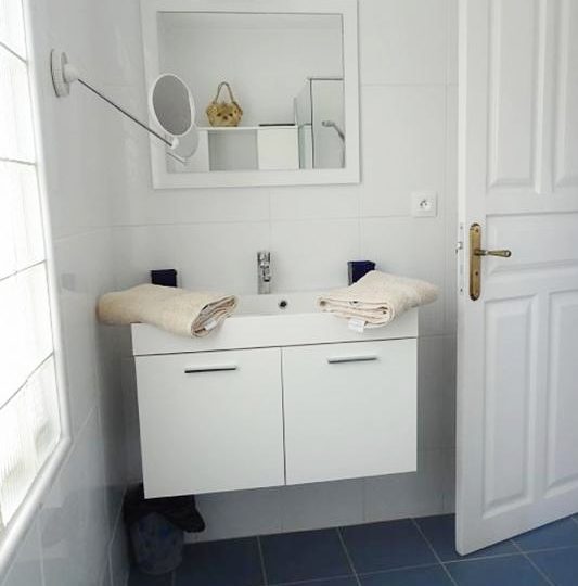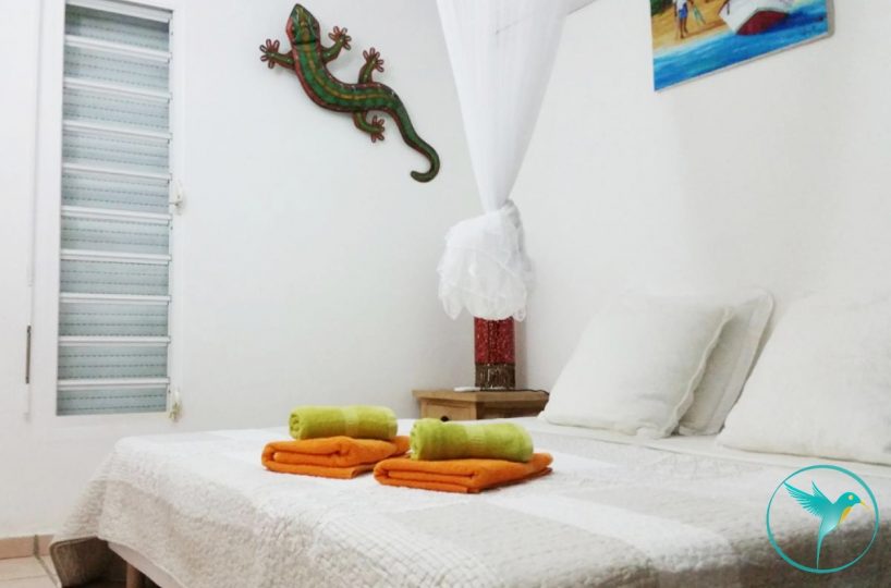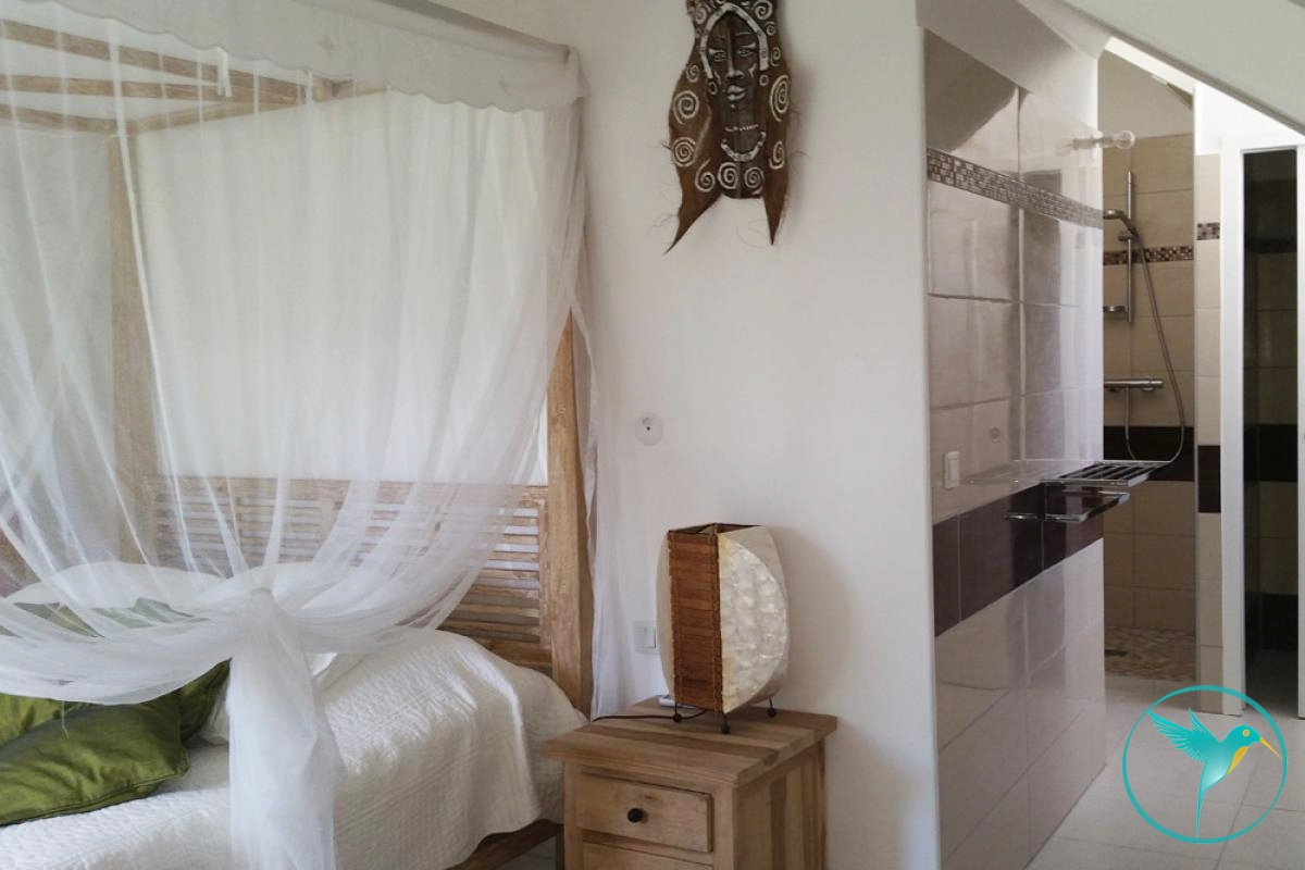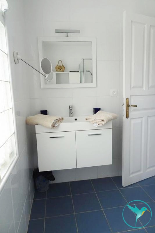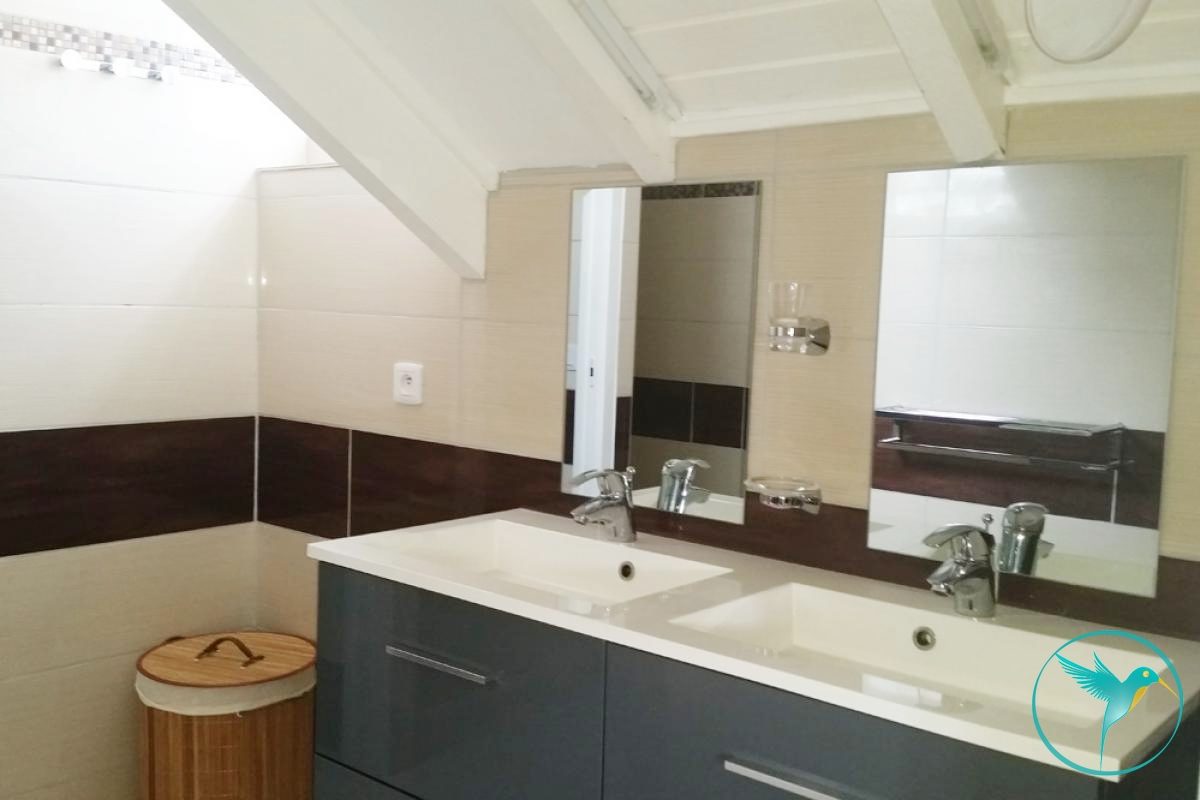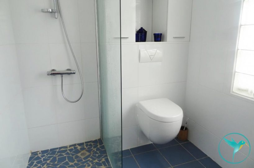 - A l’étage, 2 chambres climatisées, chacune meublée d’un lit double, avec chacune sa salle de douche privative et toilette, et une belle terrasse avec vue mer